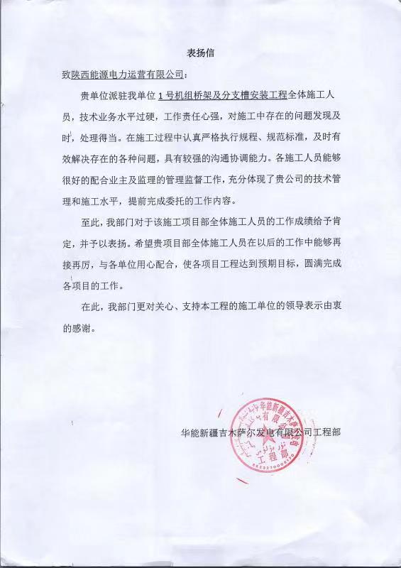 以来,机构都收到了渭河带发电厂、吉木萨尔带发电厂的感谢领导信、表扬信信。