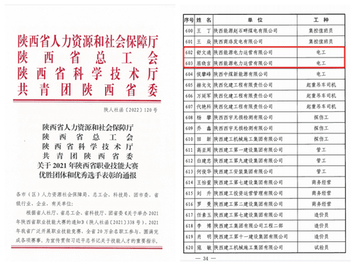 公司两名青工荣获“陕西省技术能手”荣誉称号