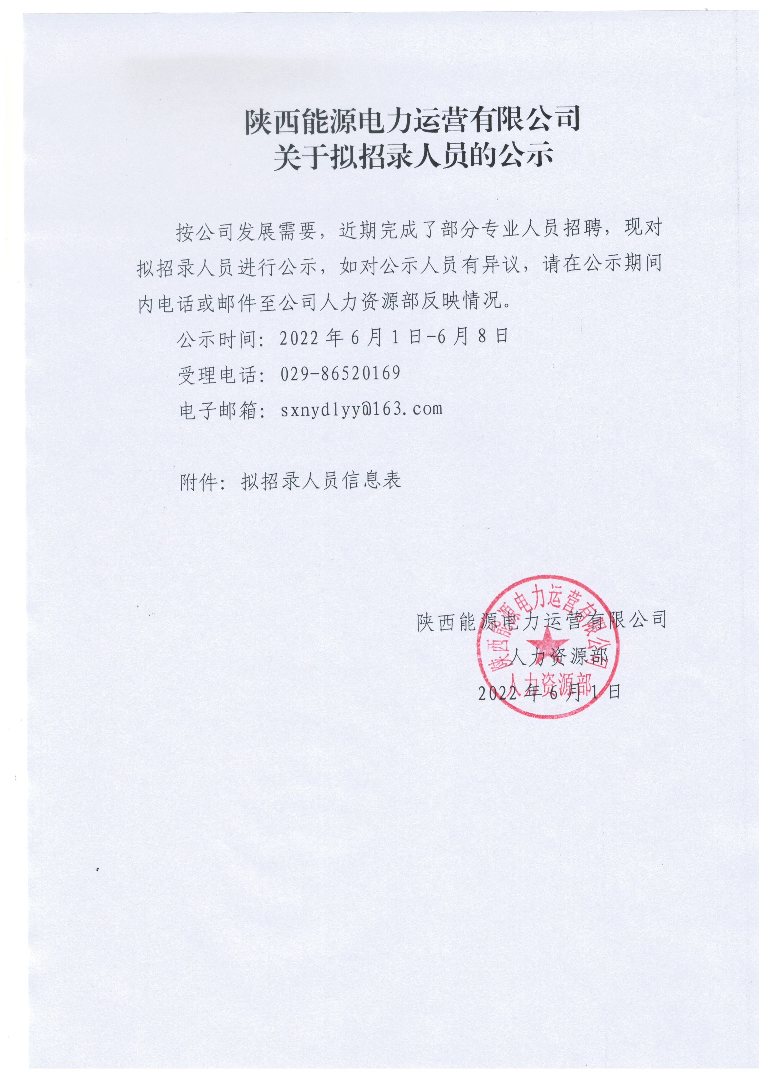 陕西能源电力运营有限公司关于拟招录人员的公示
