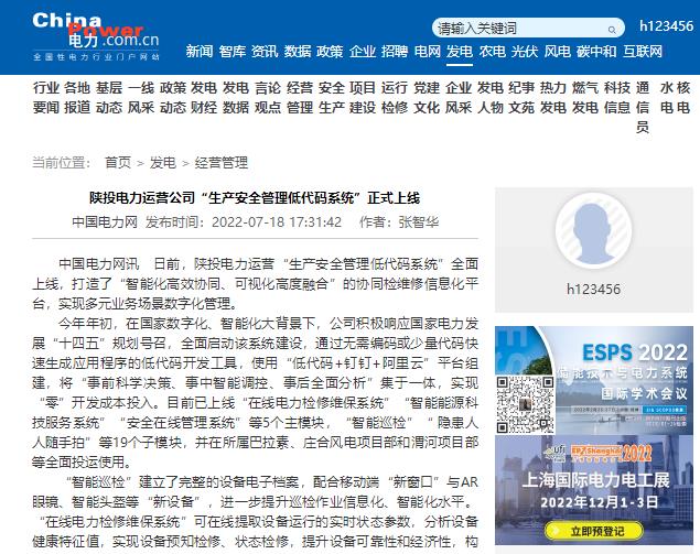 中国电力网:陕投电力运营“生产安全管理低代码系统”正式上线