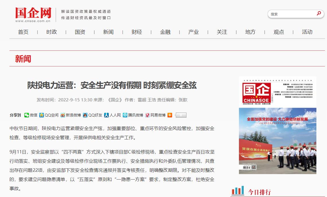 国企网:陕投电力运营 安全生产没有假期 时刻紧绷安全弦
