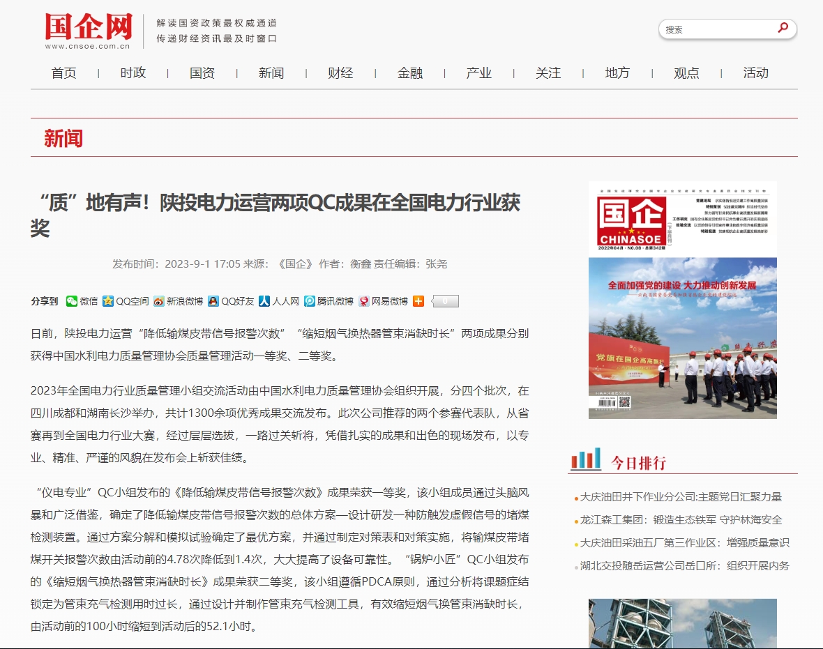 陕西国企网:“质”地有声!陕投电力运营两项QC成果在全国电力行业获奖