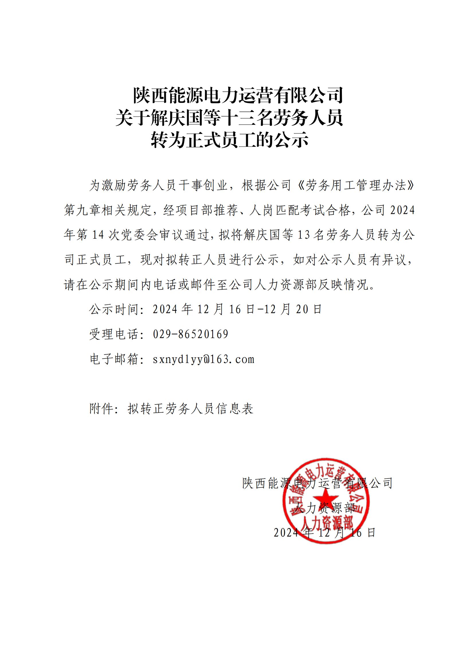 关于解庆国等十三名劳务人员转为正式员工的公示
