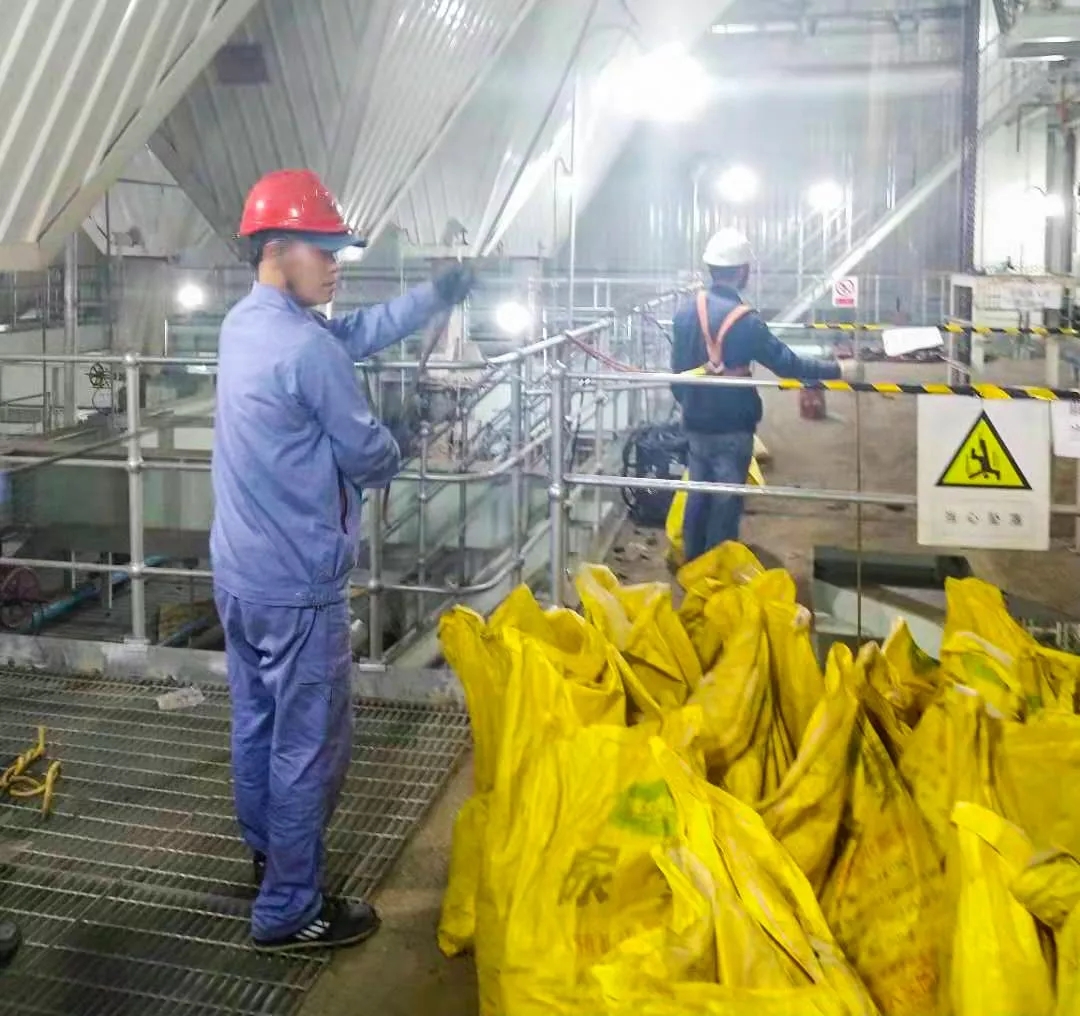 赵石畔项目部在40多度高温下清理省煤器平台的400灰袋