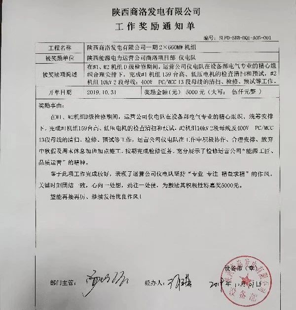 商洛项目部收到商洛发电工作奖励