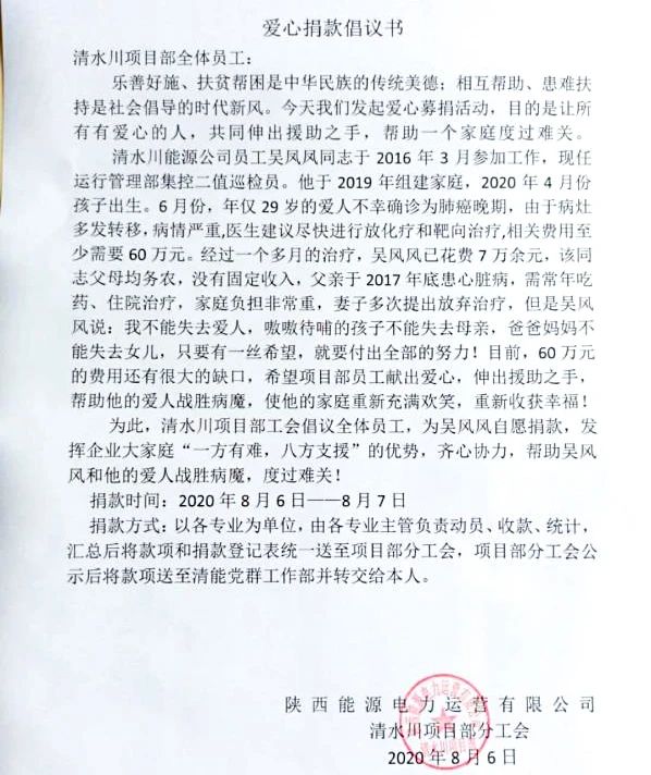🅘 近年,在知道温开水川电力能源营业员吴风风爱的人痛苦身染大病,现如今在的医院治療,费用的仍有一定突破缺口的话题后,温开水川工程要素企业工会当即向全体员工营业员发送呼吁,倡仪我们与时俱进互济、关爱留守儿童的精气神,探断球来让吴风风和亲人攻破病魔,渡过关卡!