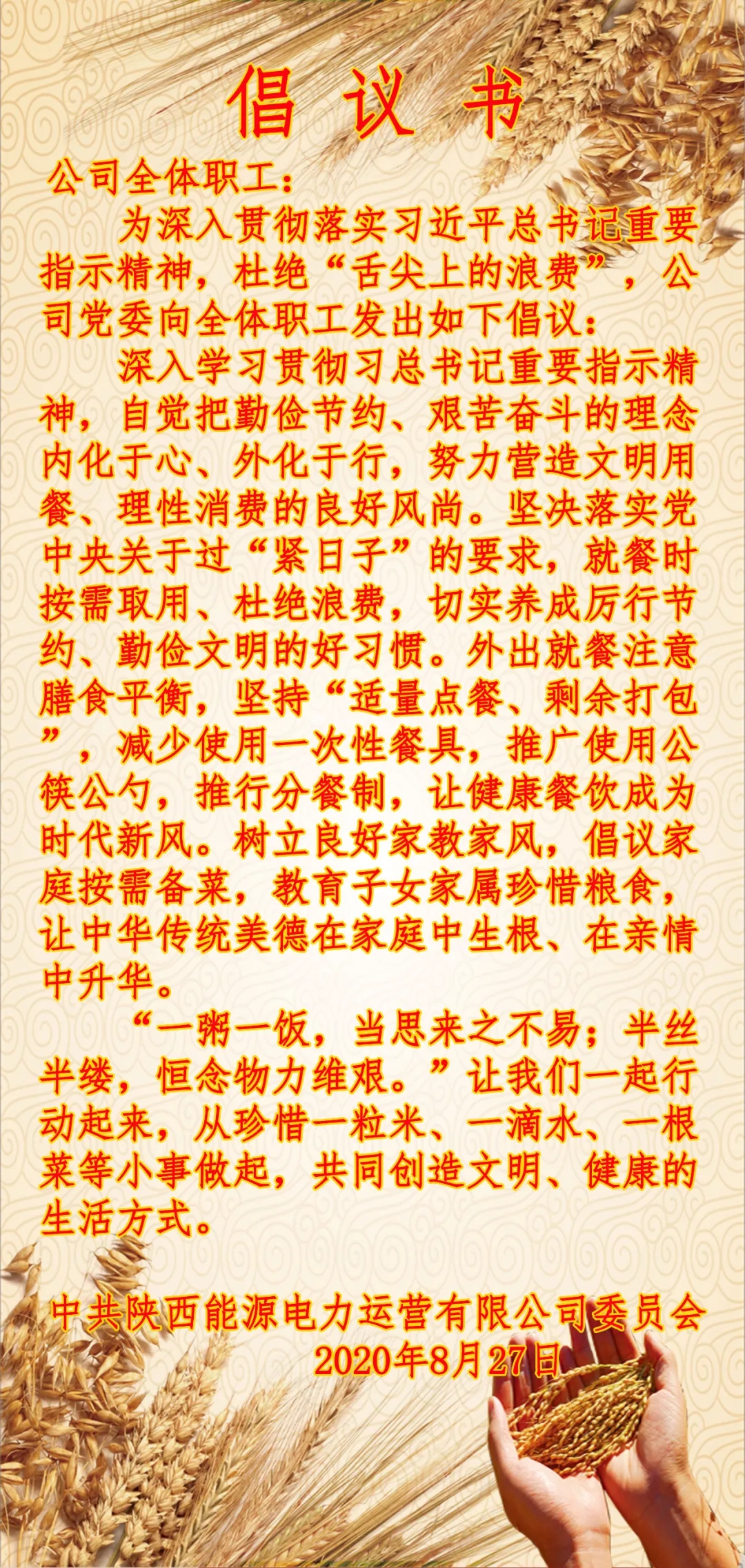 提倡节约 拒绝“舌尖上的浪费”——致公司全体职工的倡议书