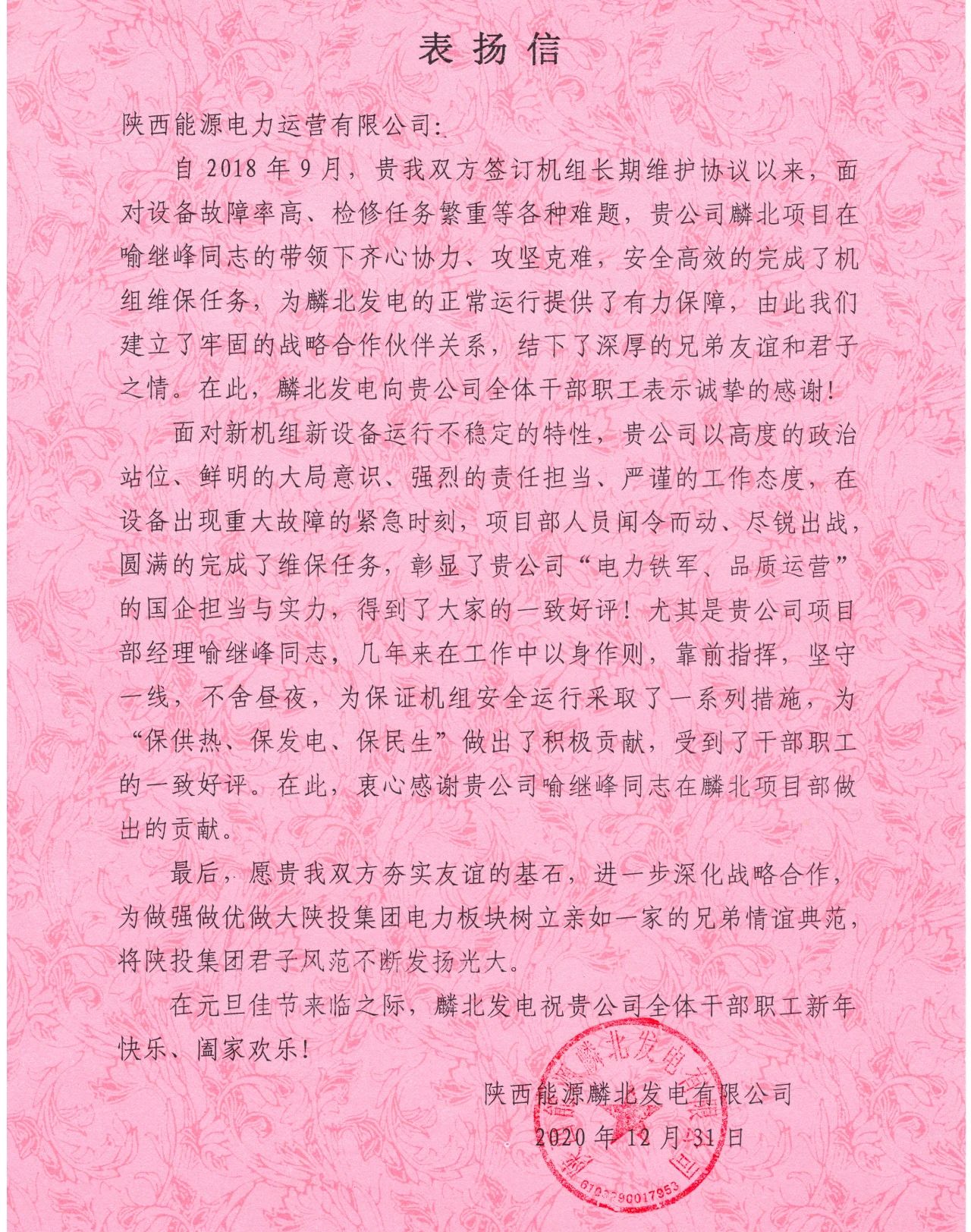 🍷寄来表示感谢信后,企业上下左右非常鼓励,看作这封赞扬信既装修业主方对企业自始做事情的应该,更是对工程经理部职工坚守岗位超一线静静的无私奉献的褒奖!在现阶段的做事情中,企业将进一大步增进与麟北来发电的战略重点合作项目,质优高效率的来完成基本巡检定检钓鱼任务,为稳步发展做优做大企业电能版块、立足亲如全家的兄第友谊更优做到坚持不懈积极。